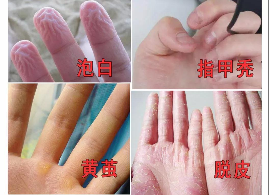 腫腫的,發白、脫皮、指甲禿、起繭