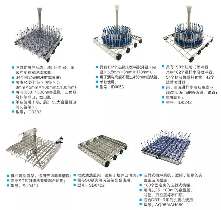 靈活的籃架組合,可洗實驗室里各種形狀大小的瓶子,如:培養皿、玻片、移液管、消解罐、色譜瓶、試管、三角瓶、錐形瓶、燒杯、燒瓶、量筒、容量瓶、西林瓶、血清瓶、漏斗等,全部都能搞定。還有專用籃架設計,可更換噴嘴結構及折彎設計,滿足雞心瓶、蒸餾器等特殊形狀器皿洗滌。